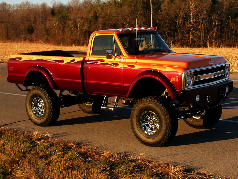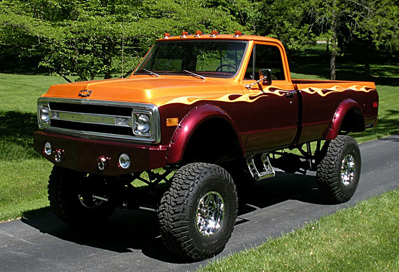 1970 Chevy 2500 4x4If you want the formula for a wicked 4×4 truck, look no further than this 2500 Chevrolet out of Martinsville, Indiana. The owner started with an 86 3/4 ton chassis, added a 10 inch lift kit, BDS shocks and massive 40″ Goodyear tires. Then stuff a Big Block 454 under the hood with 3.5″ exhaust and rock and roll! There’s a lot more to this truck than that, but if you start with those basics, you’ll have one awesome 4×4.