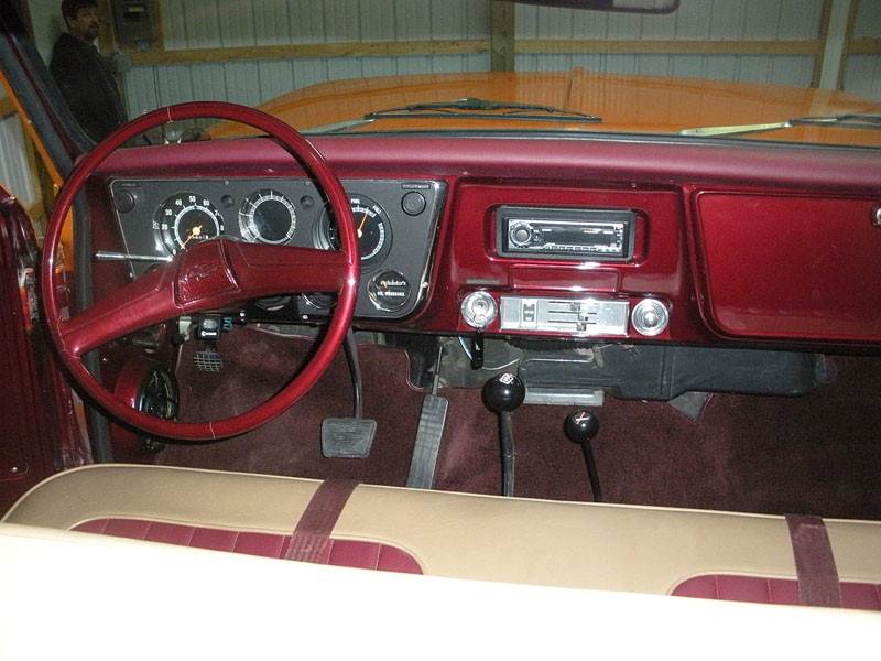 Interior: Interior is stock appearance with leather seat and dash, and all has been repainted to match exterior.  Ididit steering column with H/D joints and shaft were installed also.  Clarion AM/FM CD player with 4 speakers, 2 of which are housed in a custom cabinet made to replace where fuel tank used to be.