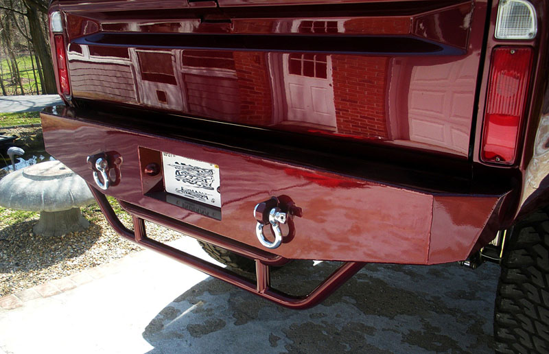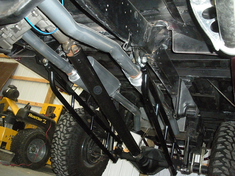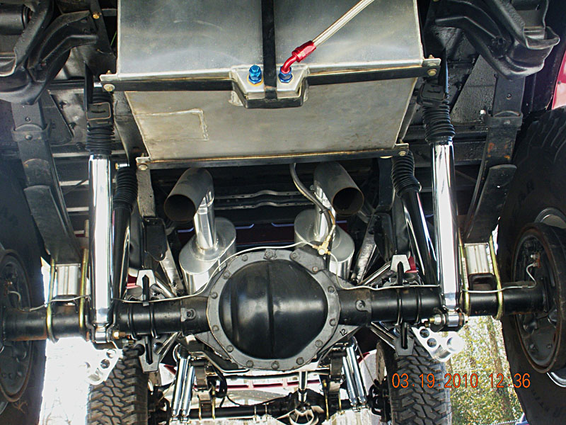 -Custom front and rear bumpers 1/4″ steel with 130 watt KC lights built in with 6″ chromemoly drops to obtain a legal ride height.