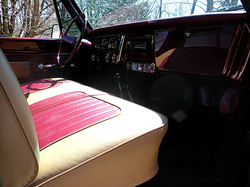 Paint: Paint is 2 tone burgundy and orange with a tan flame simulating leather like the interior appearance to break the two colors.  4 coats House of Kolor clear.