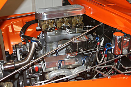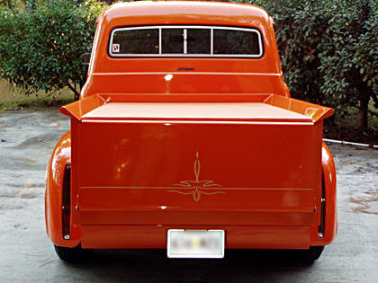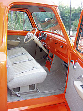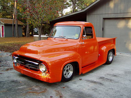 Check out this 54 F100. Flying at just the right ride height and sporting a wicked orange paint job, this Effie has all the show you could want. What’s show without go? No problem. Under the hood is a 383 stroker engine with a Concept One pulley system and 3 deuce carbs pumping through a 2-1/2″ exhaust. A 3.08 posi rear end puts the power down. Before any paint was shot, a frame off restoration was begun and a new bed was ordered.